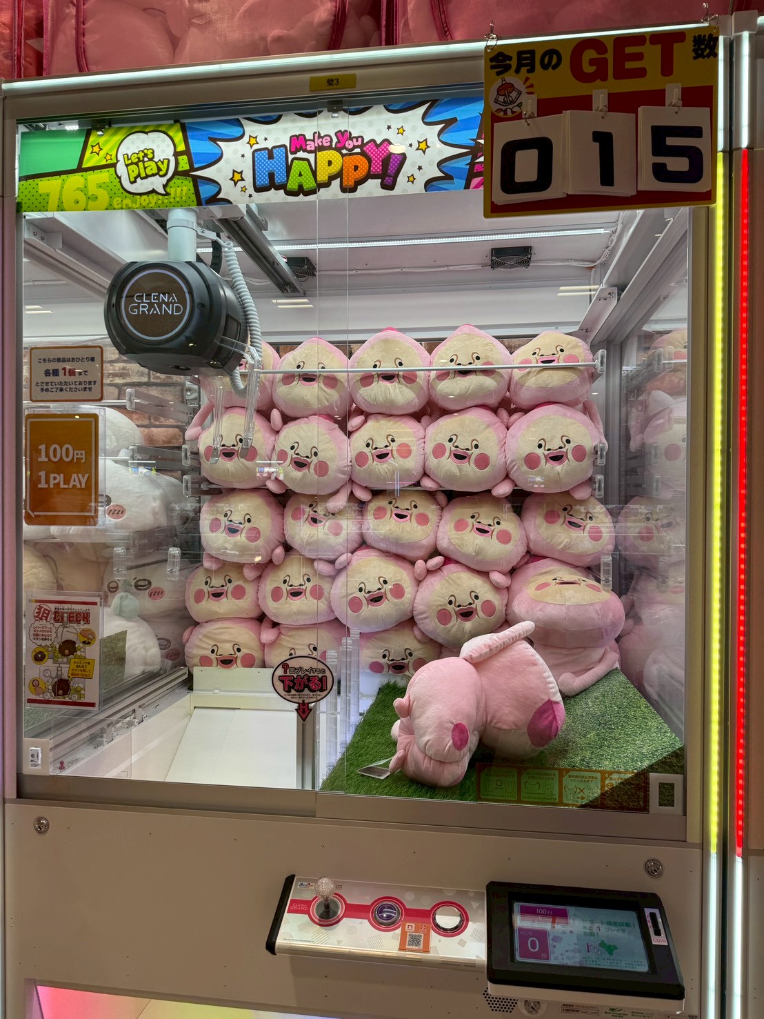 ただBIG系のぬいぐるみをオンクレで取る場合、カメラ越しの距離感と実際の景品の大きさのギャップに最初は戸惑うことが多い。特に38センチクラスになると、台の中でアームがどこを向いているか、景品のどの部分に当たったかが画面越しには掴みにくい。